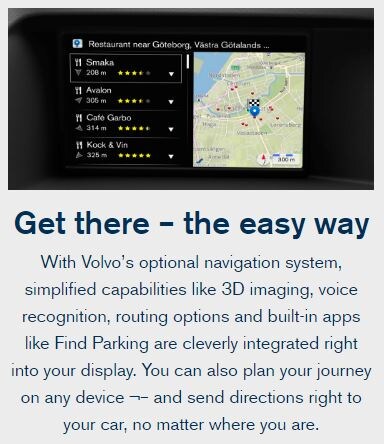Volvo's optional navigation system packs a wallop of technology with simplified capabilities like 3D imaging, voice recognition, routing options and even Find Parking. All of these are cleverly integrated right into your Navigation's Display. You can plan your trip on any device and then send those to directions right to your car no matter where you are.Â